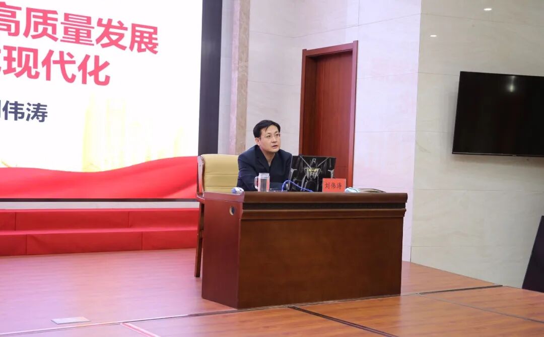 1月3日,通辽铁路运输检察院召开党组理论学习中心组(扩大)会议暨党支部政治例会,党组成员、副检察长刘伟涛以《以检察工作的高质量发展助推中国式现代化》为题讲授专题党课。院领导班子成员、各部门负责人和全体干警参加会议。
